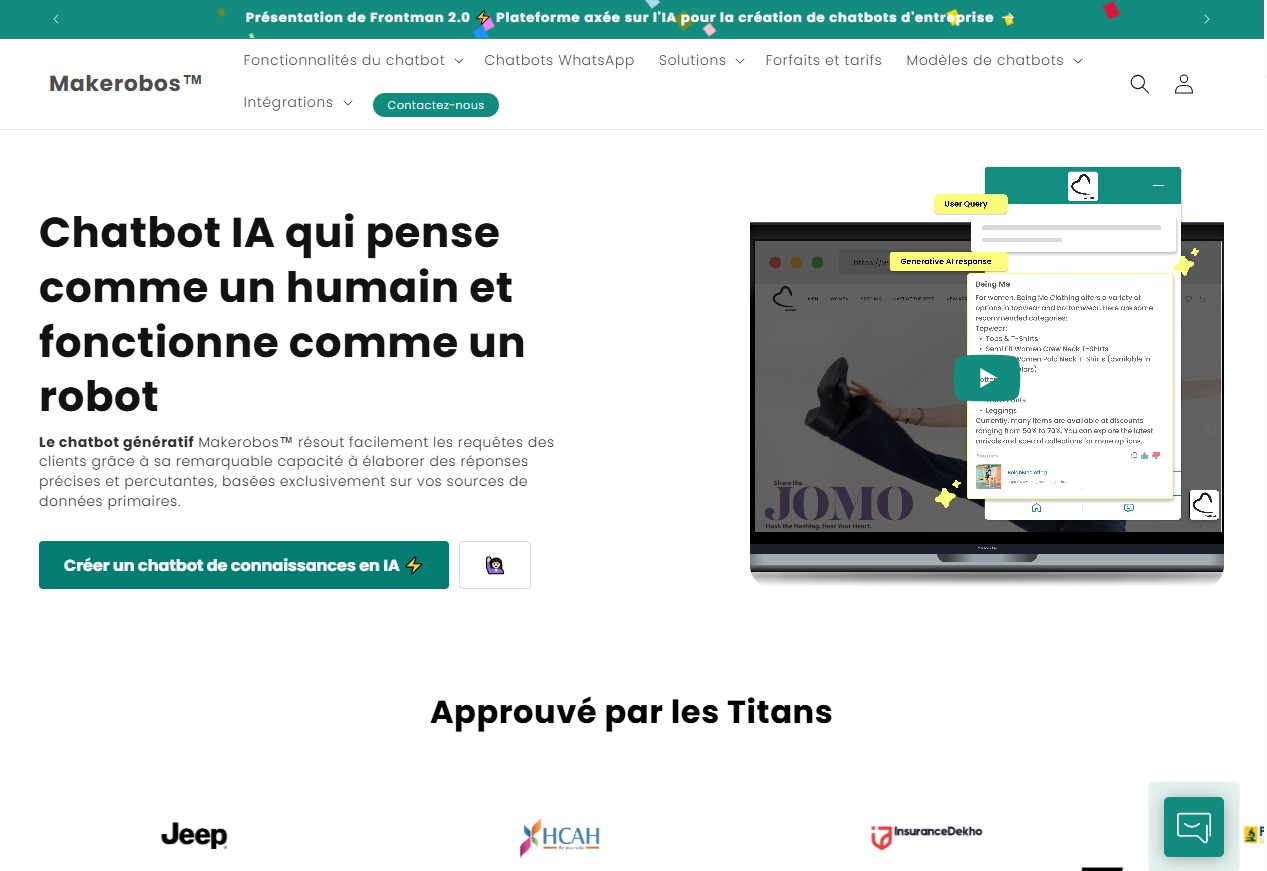 Personnalisation simple et évolutive Ajoutez, modifiez ou adaptez vos scénarios de conversation en quelques clics, sans compétences techniques. Votre chatbot IA évolue avec votre activité pour rester toujours pertinent (FAQ évolutive, tunnel de vente automatisé, service client intelligent,...)