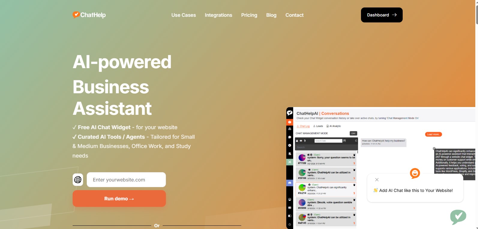 ChatHelp.ai est un chatbot IA simple et puissant qui s’entraîne sur vos documents et vos pages web. Installez-le en quelques minutes pour répondre automatiquement à vos visiteurs et capturer des leads.